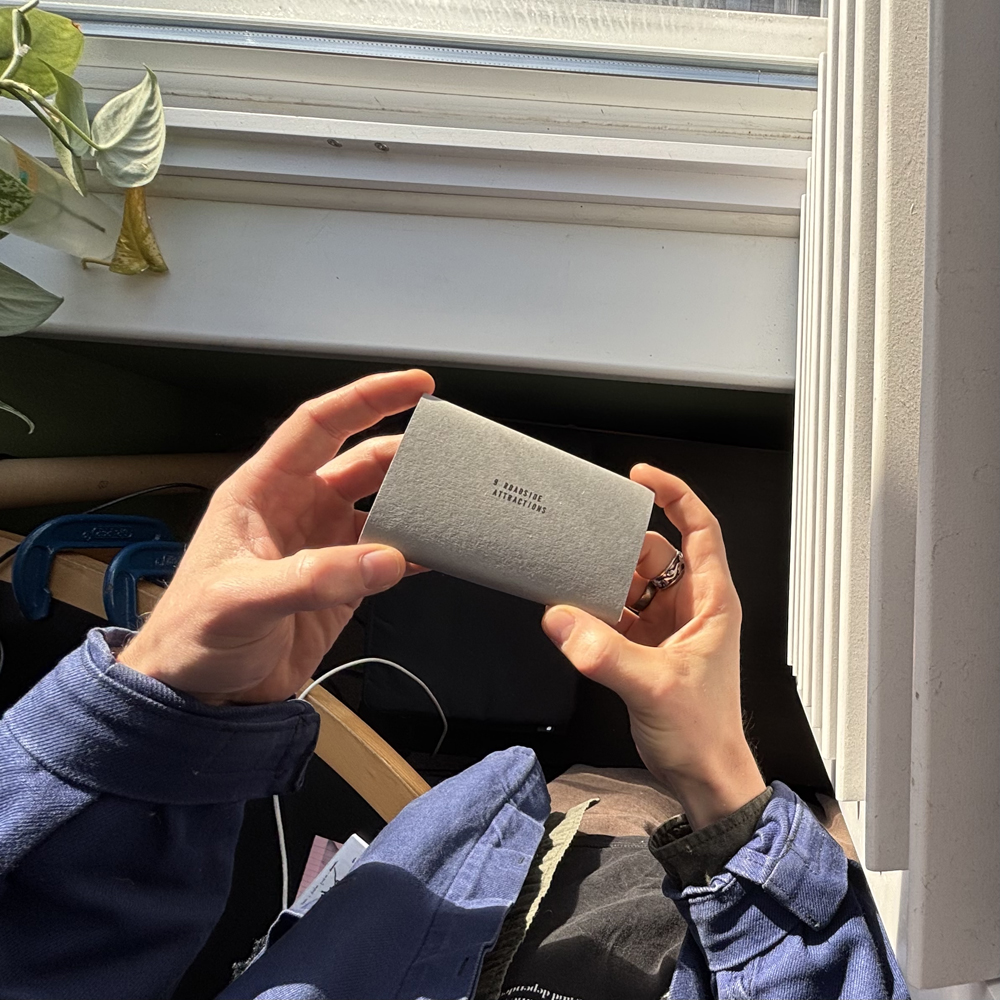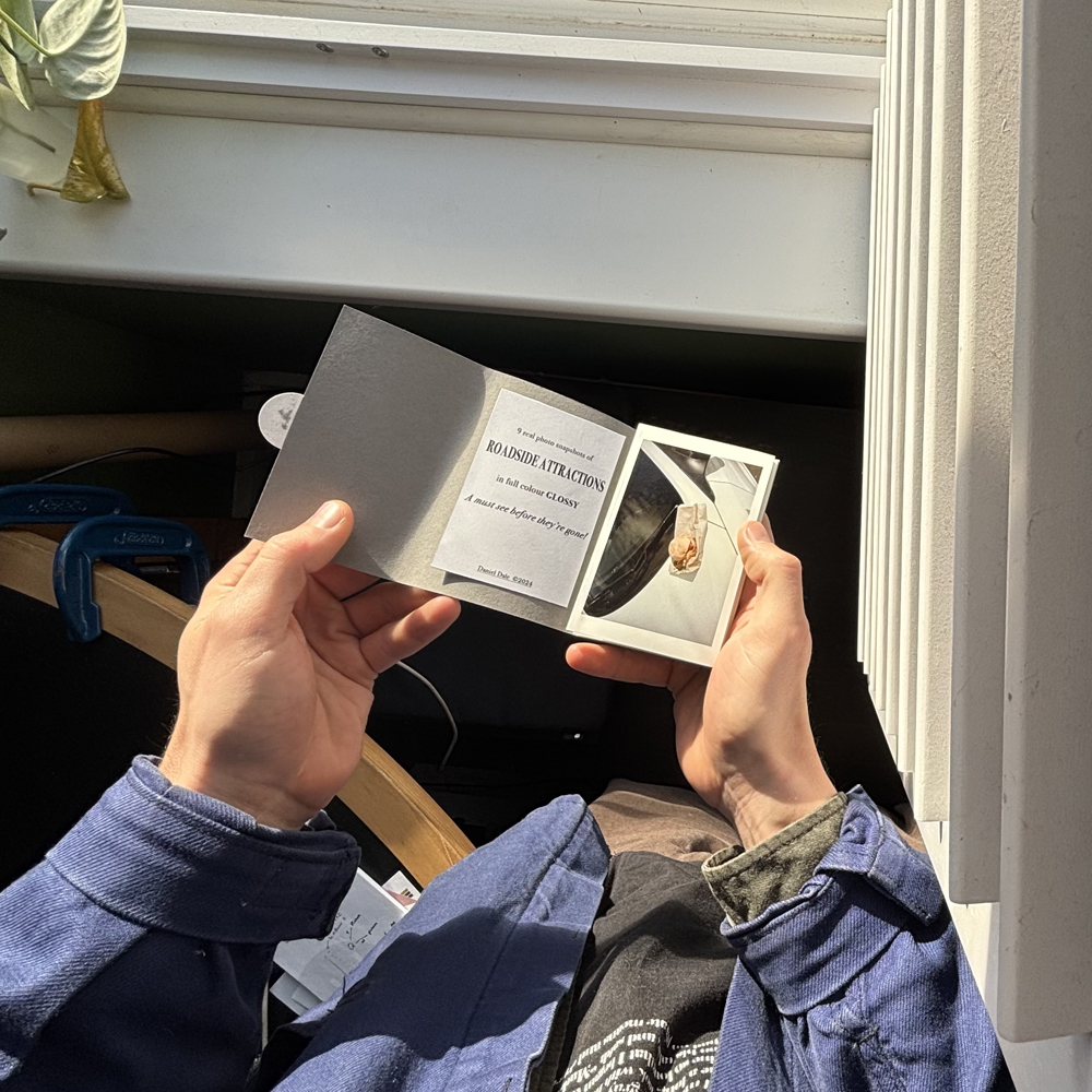 Inspired and stolen from Richard Long's '9 Standing Stones', '9 Roadside Attractions' applies a pocketable concertina design so that you may take the memories of your visit anywhere with you. Unlike Long's stones, unmoving and natural stature, 'Attractions' is temporary in its position, and so only available for visitation within a small period of time. Although the organic pieces will no longer be visible elsewhere, the more plastic installs will be on loan elsewhere for 100s of years. The work is produced in a practice of 'seeing', or 'noticing', but is also reminded of an impact we may have on our surroundings.
